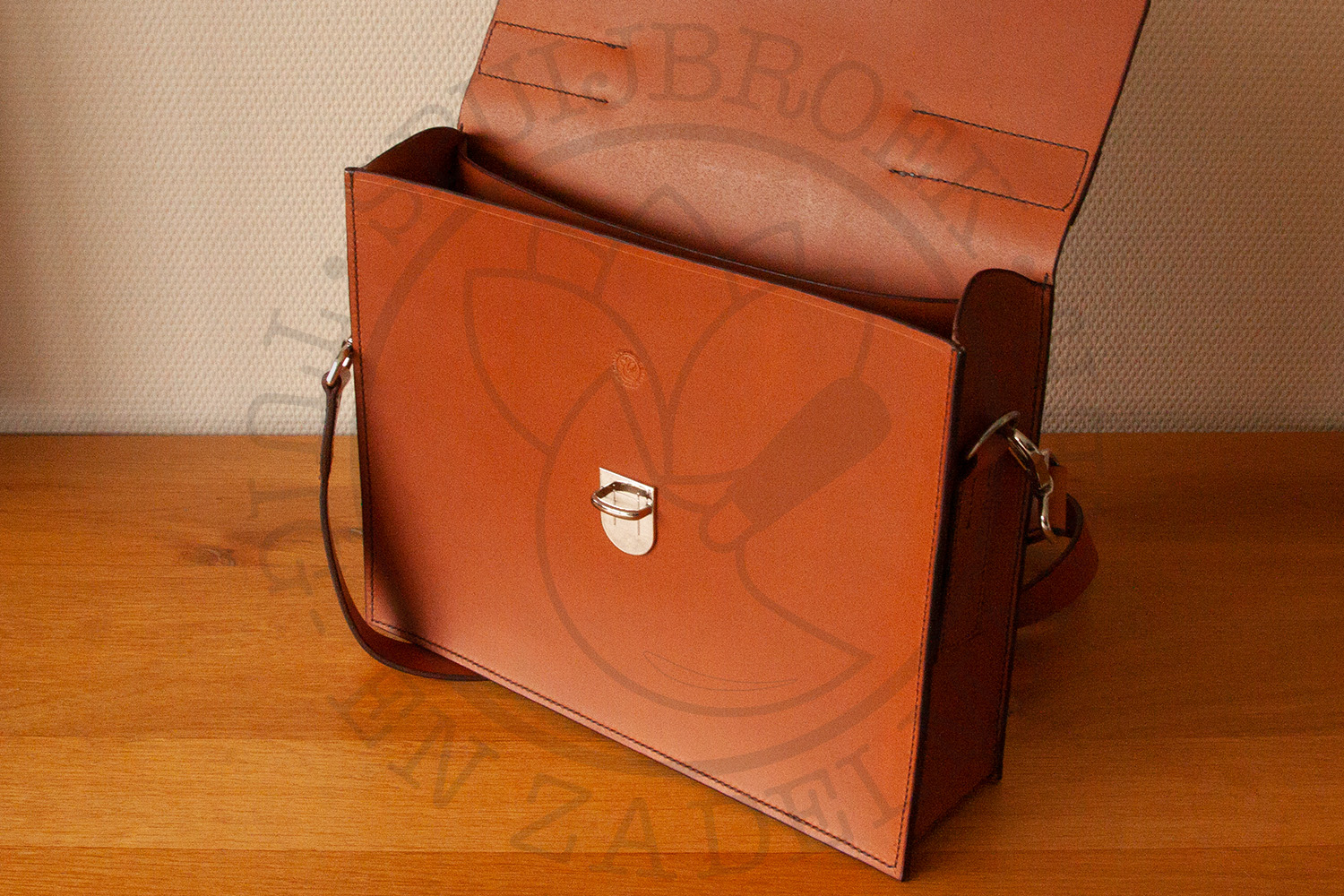 Een schooltas of aktentas met domino souflet. De 1e tas is gemaakt van 1,2mm dik groen vegetaal gelooid meubelleer en verstevigd / gevoerd met 1,5mm dik tuigleer. De tas heeft een van tuigleer gemaakt handvat en een met gesp verstelbare draagriem. De tas wordt gesloten met een steeksluiting. Aan de binnenkant een zakje voor bijvoorbeeld pennen en een lus. Afmetingen buitenmaats ca. 36x26x6cm, binnenmaats 33x25,5x5,5cm. Eigen ontwerp.