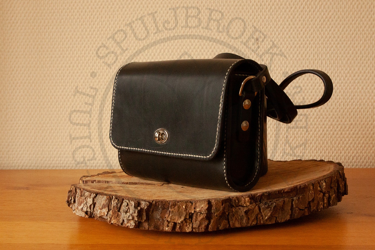 Een schoudertasje met zwevende souflet. Het tasje is gemaakt van 1,2mm dik groen vegetaal gelooid meubelleer en verstevigd / gevoerd met 1,5mm dik tuigleer. De tas heeft een van tuigleer gemaakte draagriem. De tas wordt gesloten met een draaisluiting. Aan de binnenkant een vakje voor bijvoorbeeld een paspoort. Afmetingen buitenmaats ca. 18x14x6cm, binnenmaats 15x12x5cm. Eigen ontwerp.